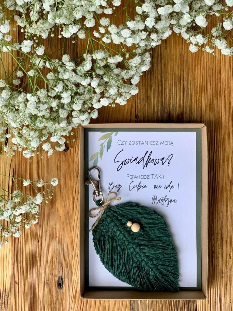 Całość przewiązana jest naturalnym, białym sznurkiem ozdobionym bilecikiem z imieniem Twojej Świadkowej.