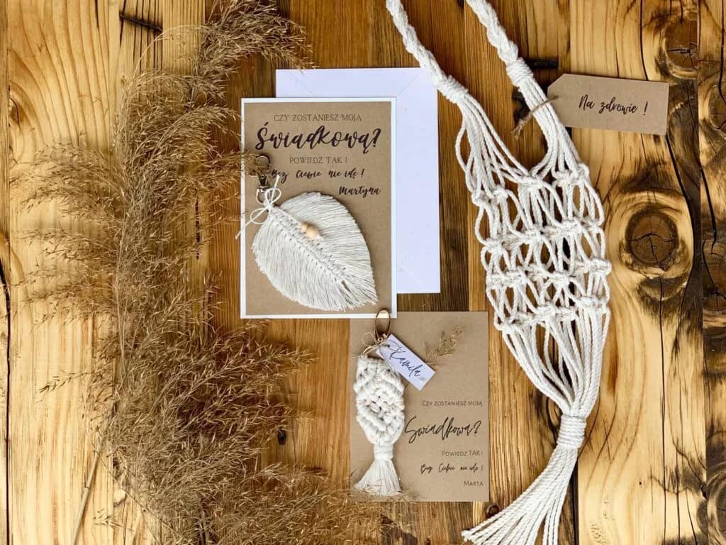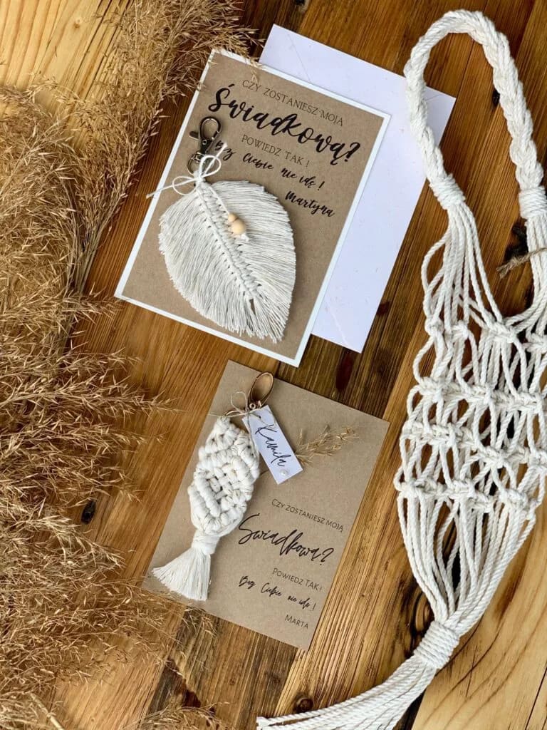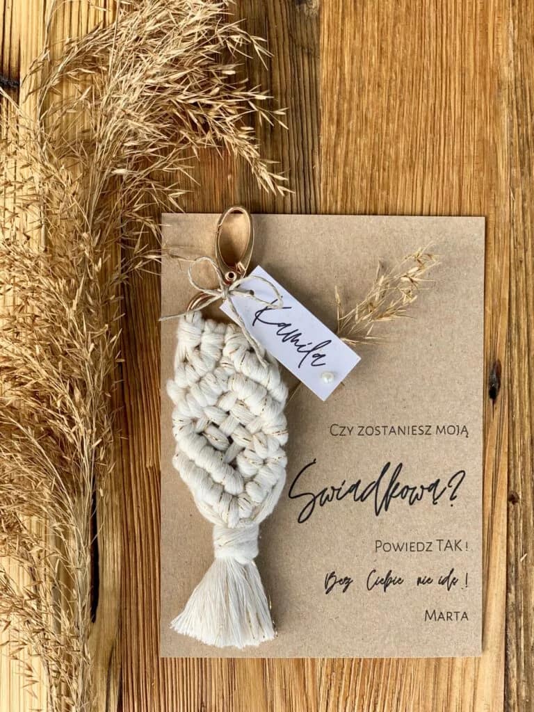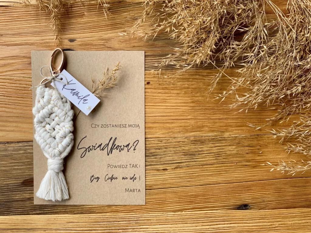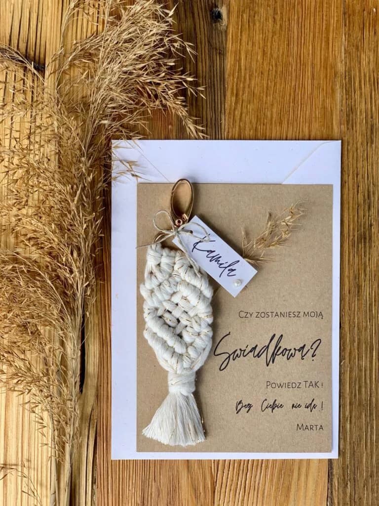 Urocza kartka upominkowa makramowym breloczkiem w stylu boho ucieszy Twoją przyszłą Świadkową. Ten drobny gest sprawi, że poczuje się wyjątkowa i niezastąpiona.