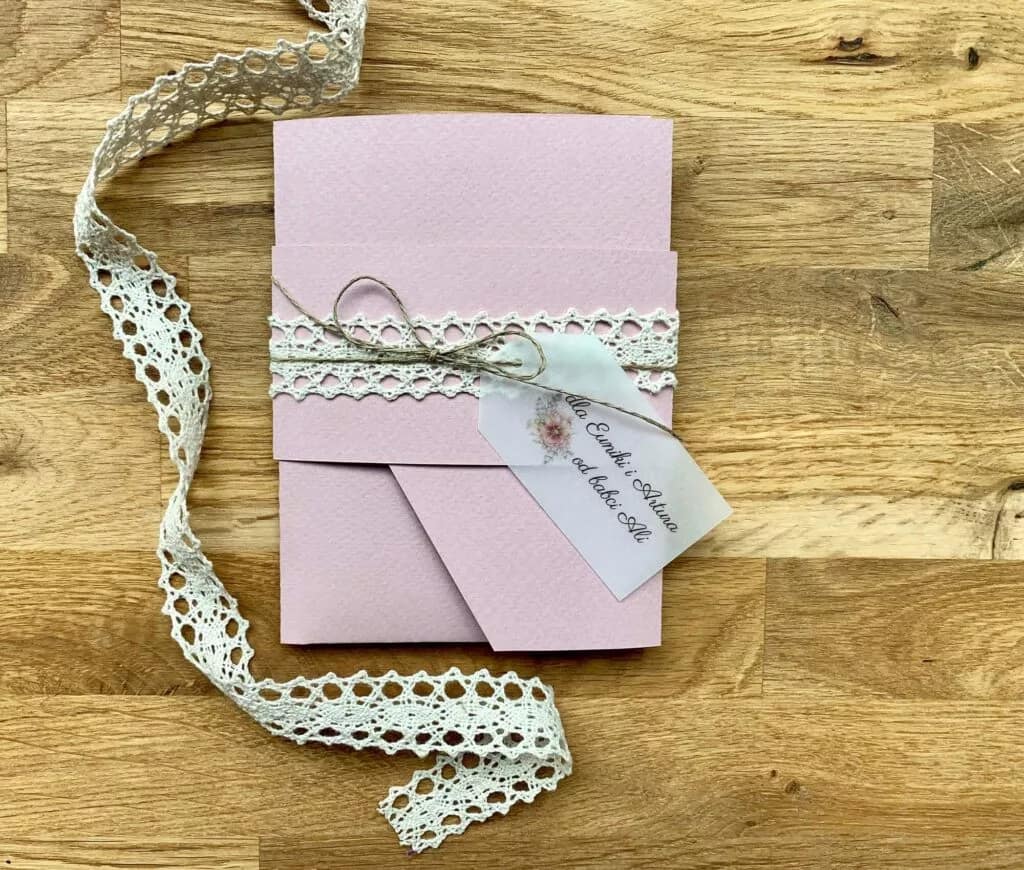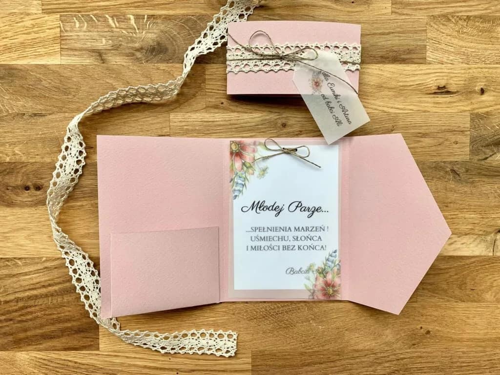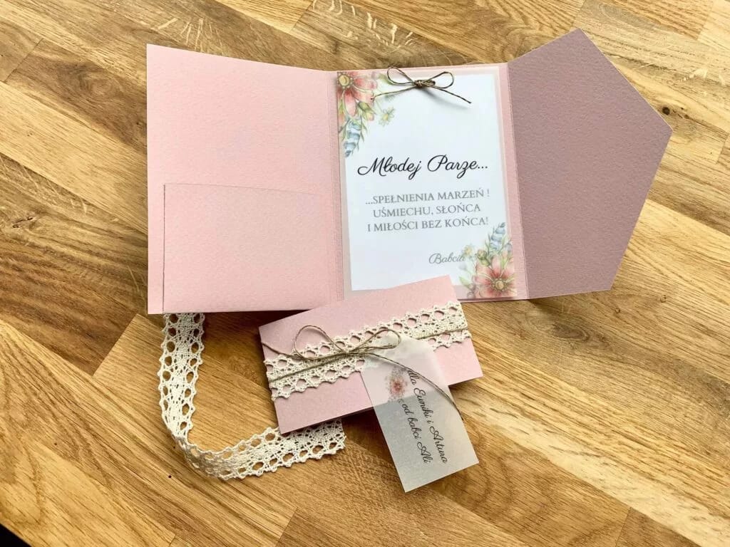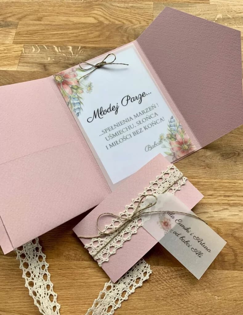 Karta ma formę ręcznie robionej koperty, z kieszonką na gotówkę, życzeniami i kalką.