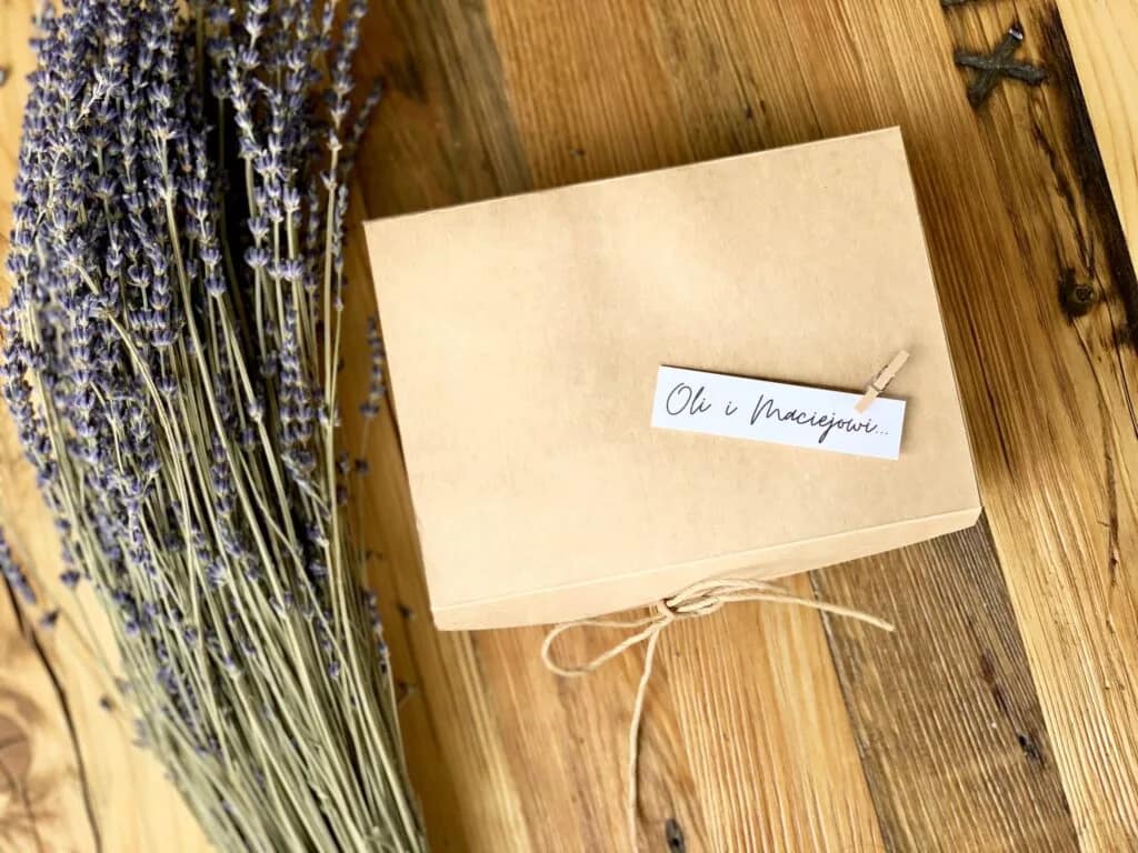 Wszystkie elementy umieszczone są w tekturowym, zamykanym pudełku o wymiarach 21 cm x 15 cm x 8 cm. Całość wzbogaca napis „W dniu Waszego Ślubu…” wykonany na naturalnym papierze wzbogacony gałązką lawendy.