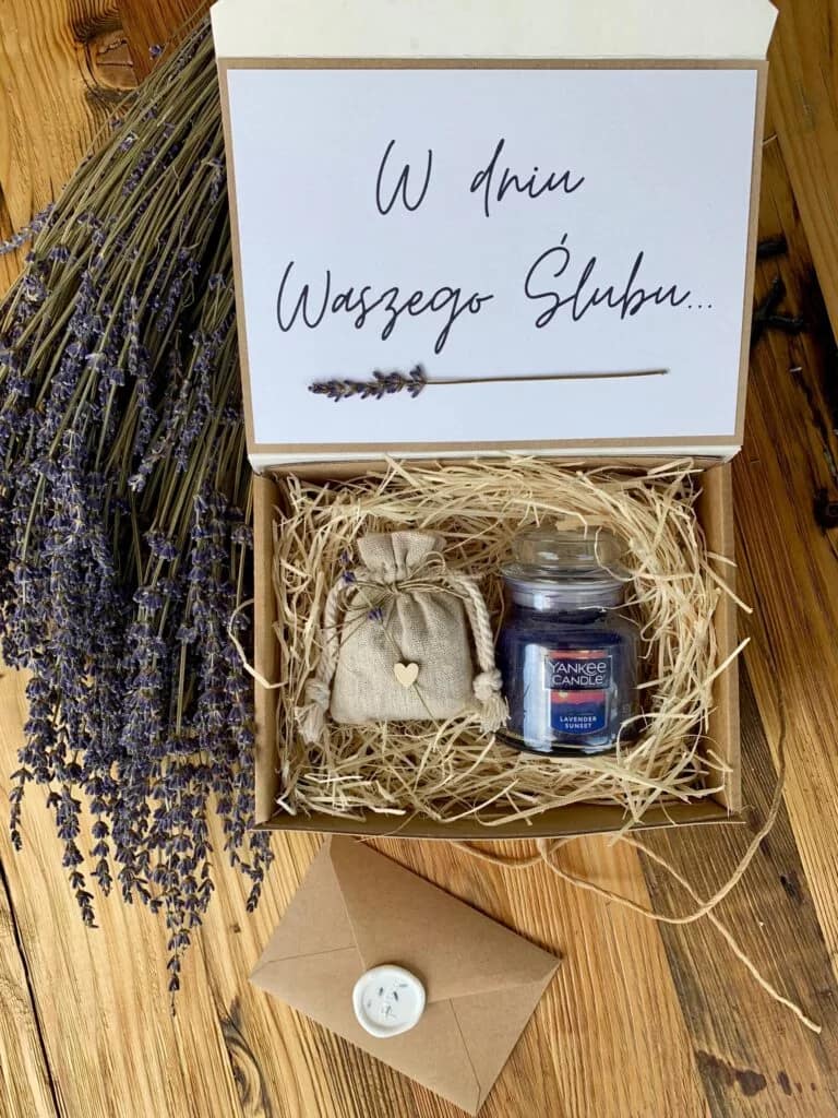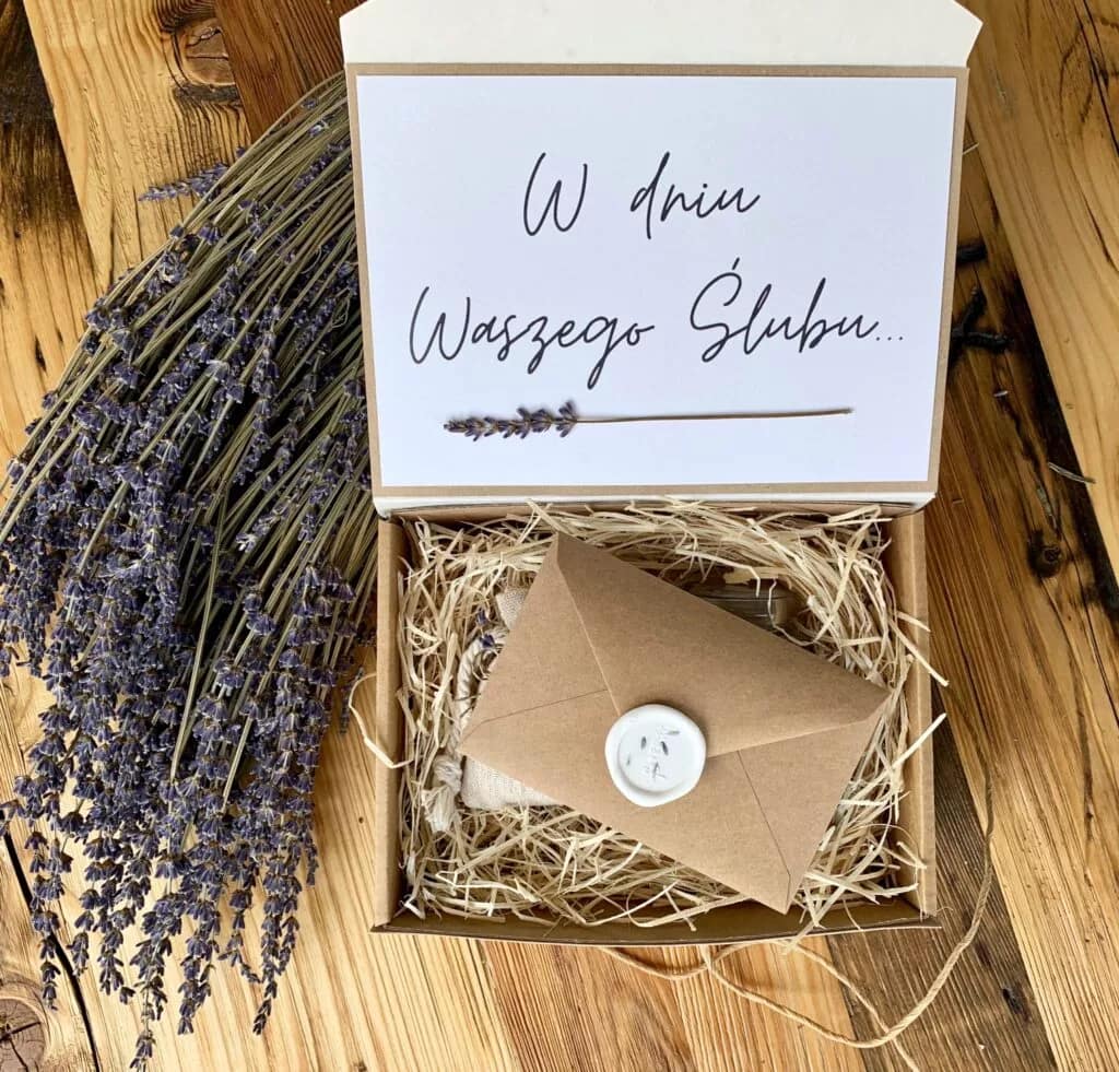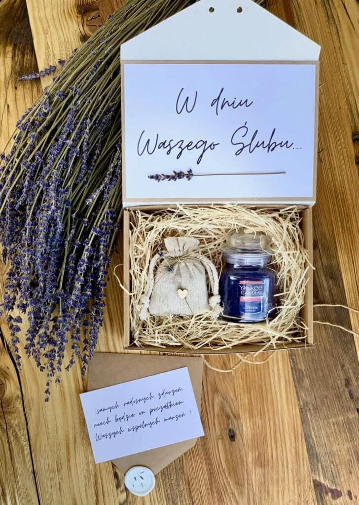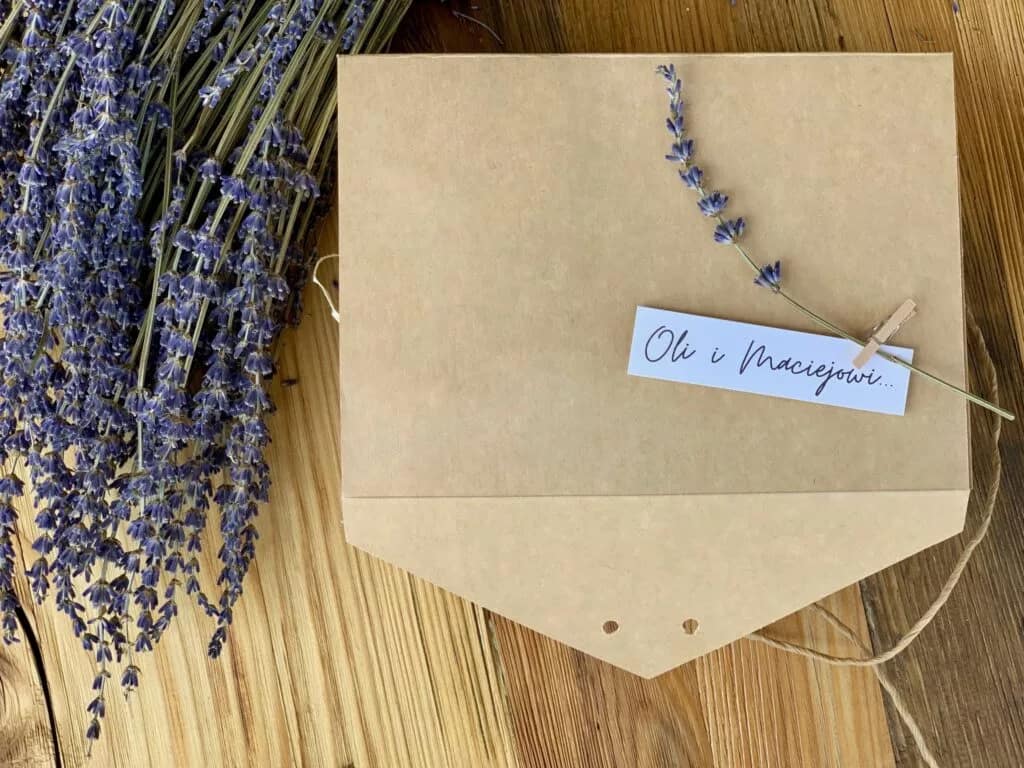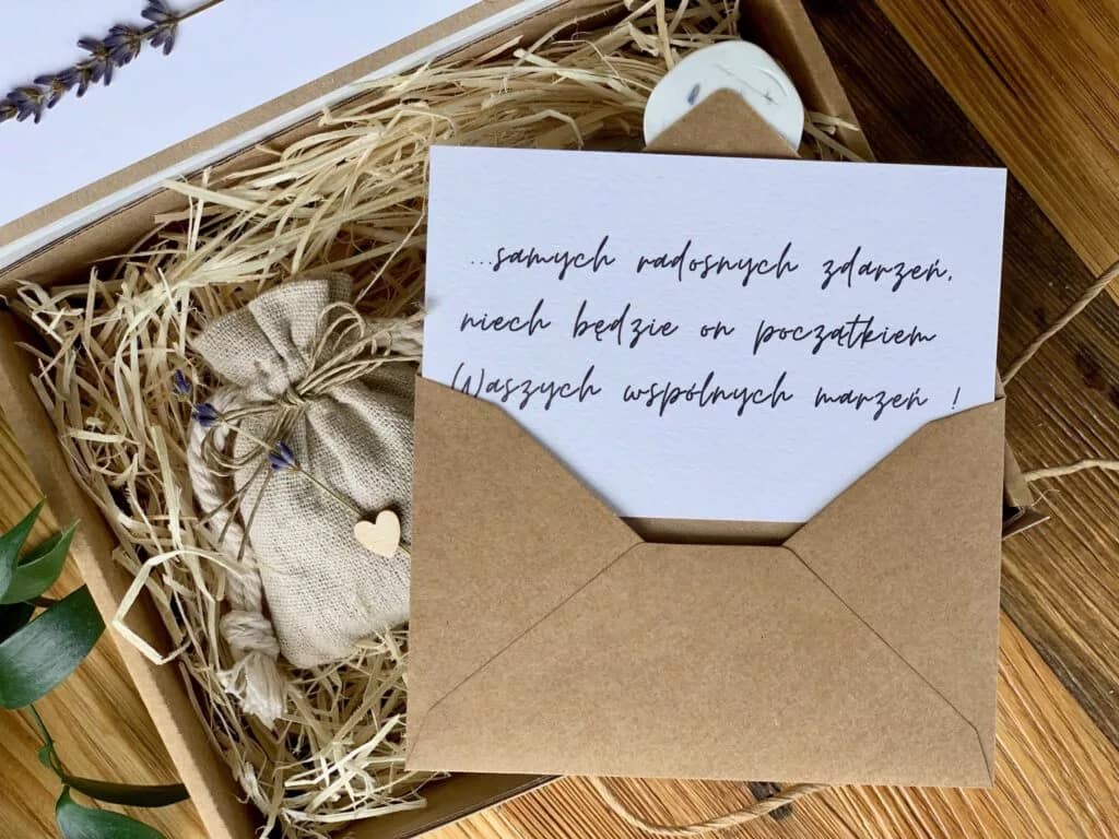Do zestawu upominkowego dołączony jest spersonalizowany bilecik z życzeniami wykonany z tego samego papieru, w eko kopercie zamykanej białym lakiem z motywem lawendy. „ … samych radosnych zdarzeń, niech będzie on początkiem waszych wspólnych marzeń! „