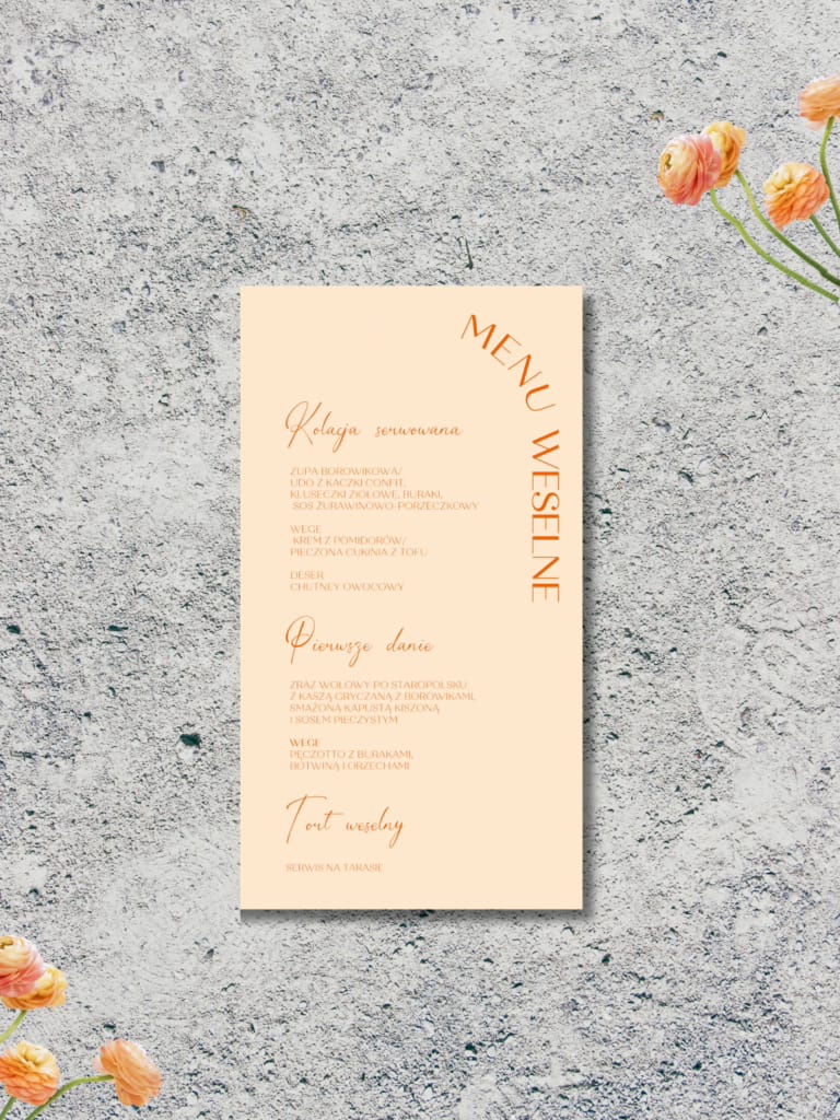 Do wybranego wzoru istnieje możliwość zamówienia pozostałych dodatków papeteryjnych takich jak: winietki, zawieszki na alkohol, numery stołów, tablica powitalna, księga gości, czy plan stołów.