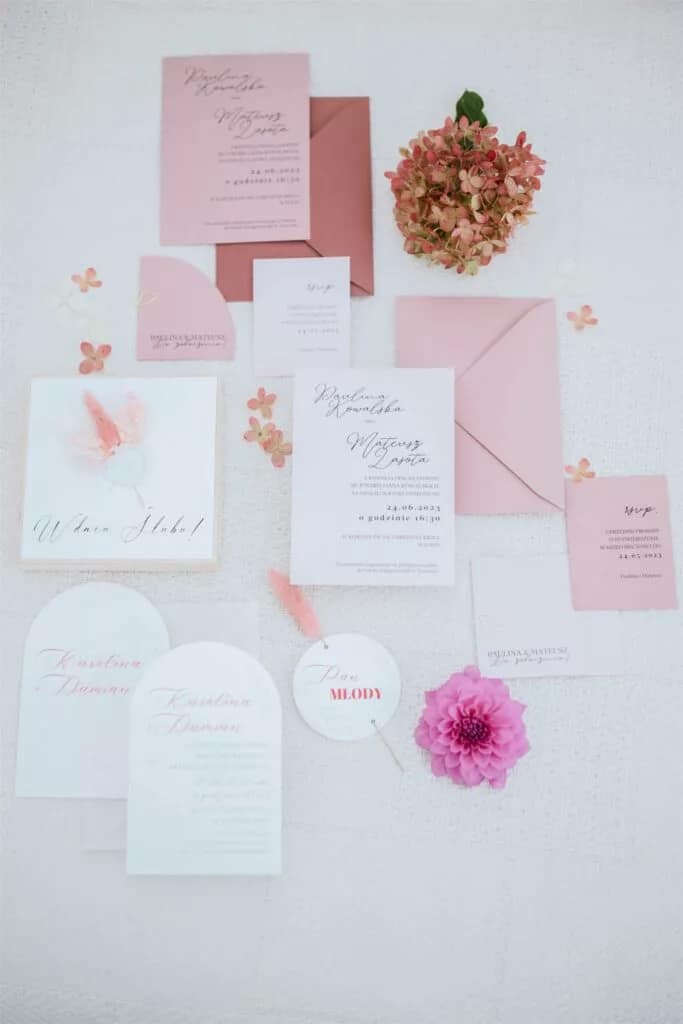Do każdego wzoru zaproszeń istnieje możliwość zamówienia pozostałych dodatków papeteryjnych takich jak winietki, zawieszki na alkohol, numery stołów czy plan stołów.