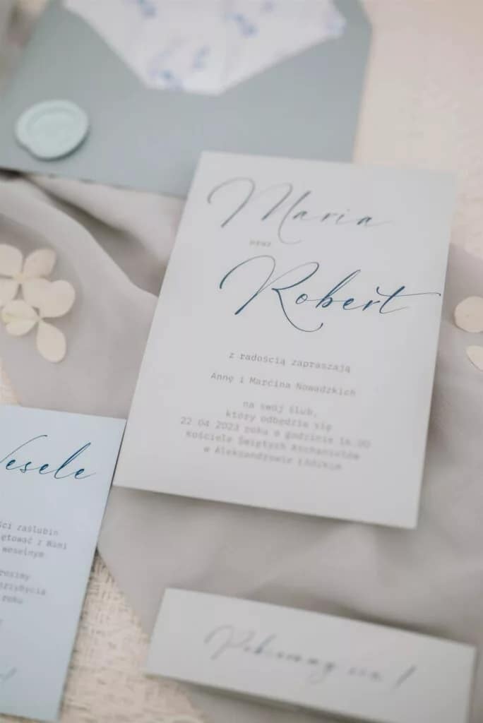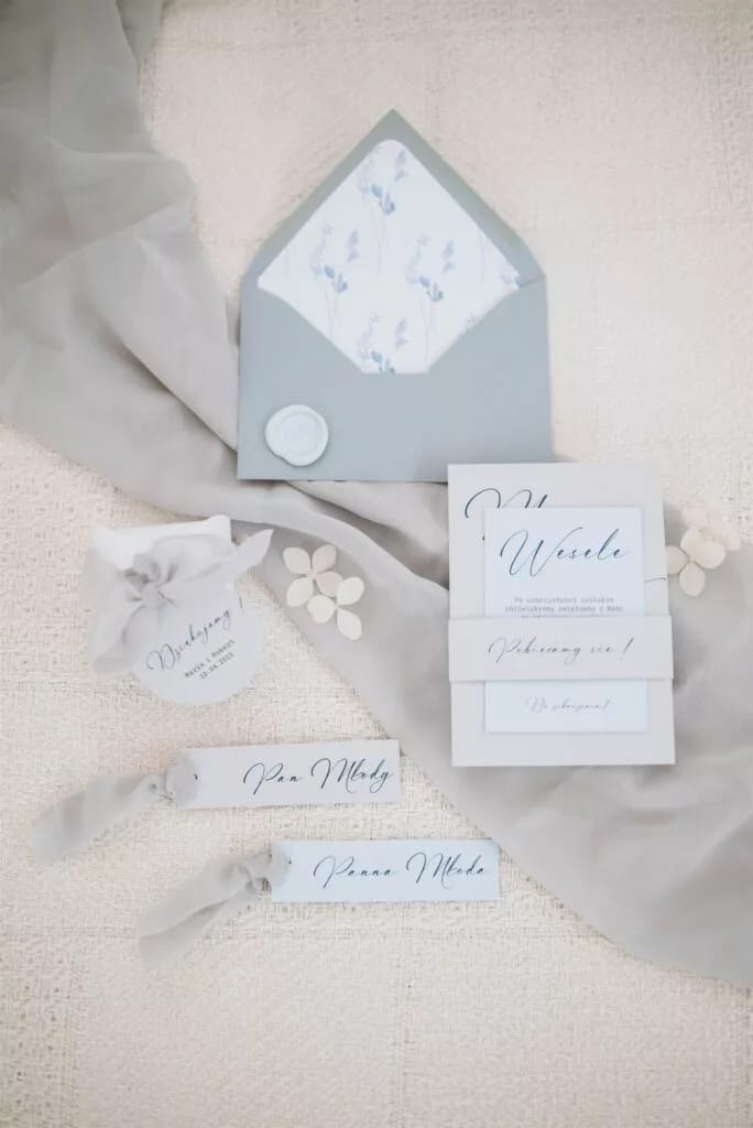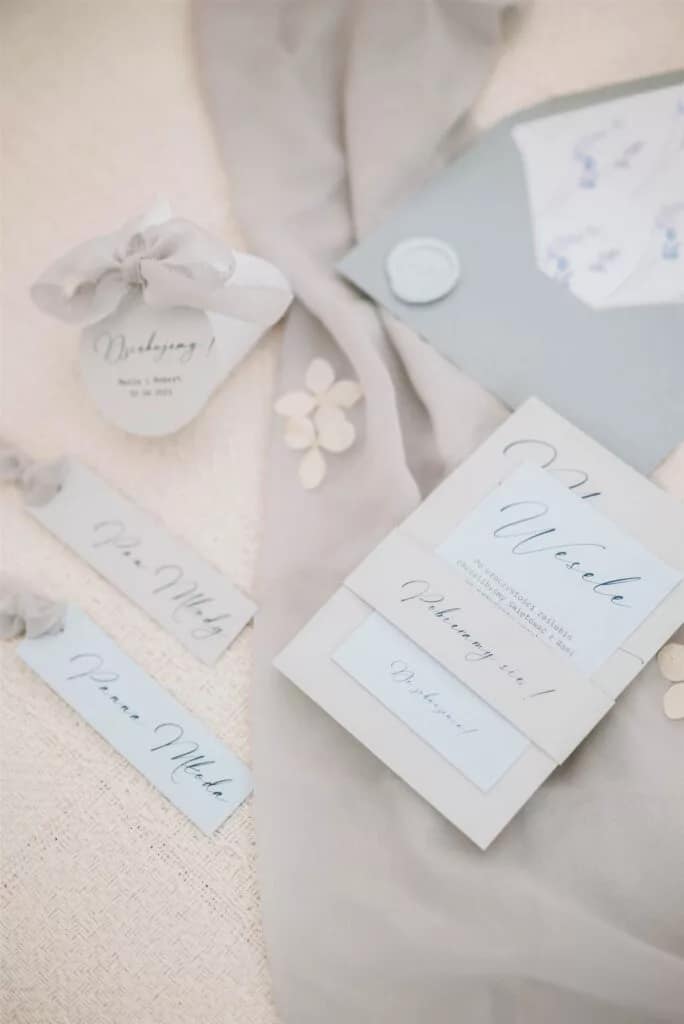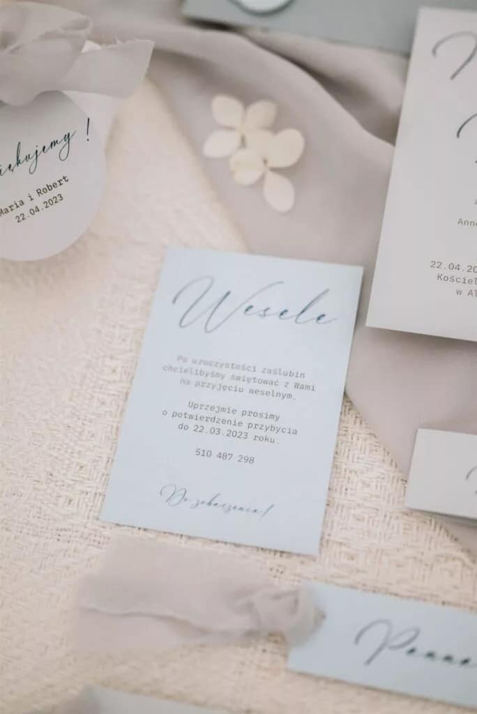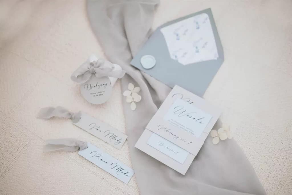 Do każdego wzoru zaproszeń istnieje możliwość zamówienia pozostałych dodatków papeteryjnych takich jak winietki, zawieszki na alkohol, numery stołów, pudełka z podziękowaniem czy plan stołów.