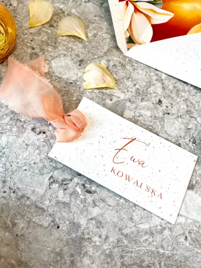 Do wybranego wzoru zaproszeń istnieje możliwość zamówienia pozostałych dodatków papeteryjnych takich jak: winietki, zawieszki na alkohol, numery stołów, menu, księga gości, czy plan stołów.